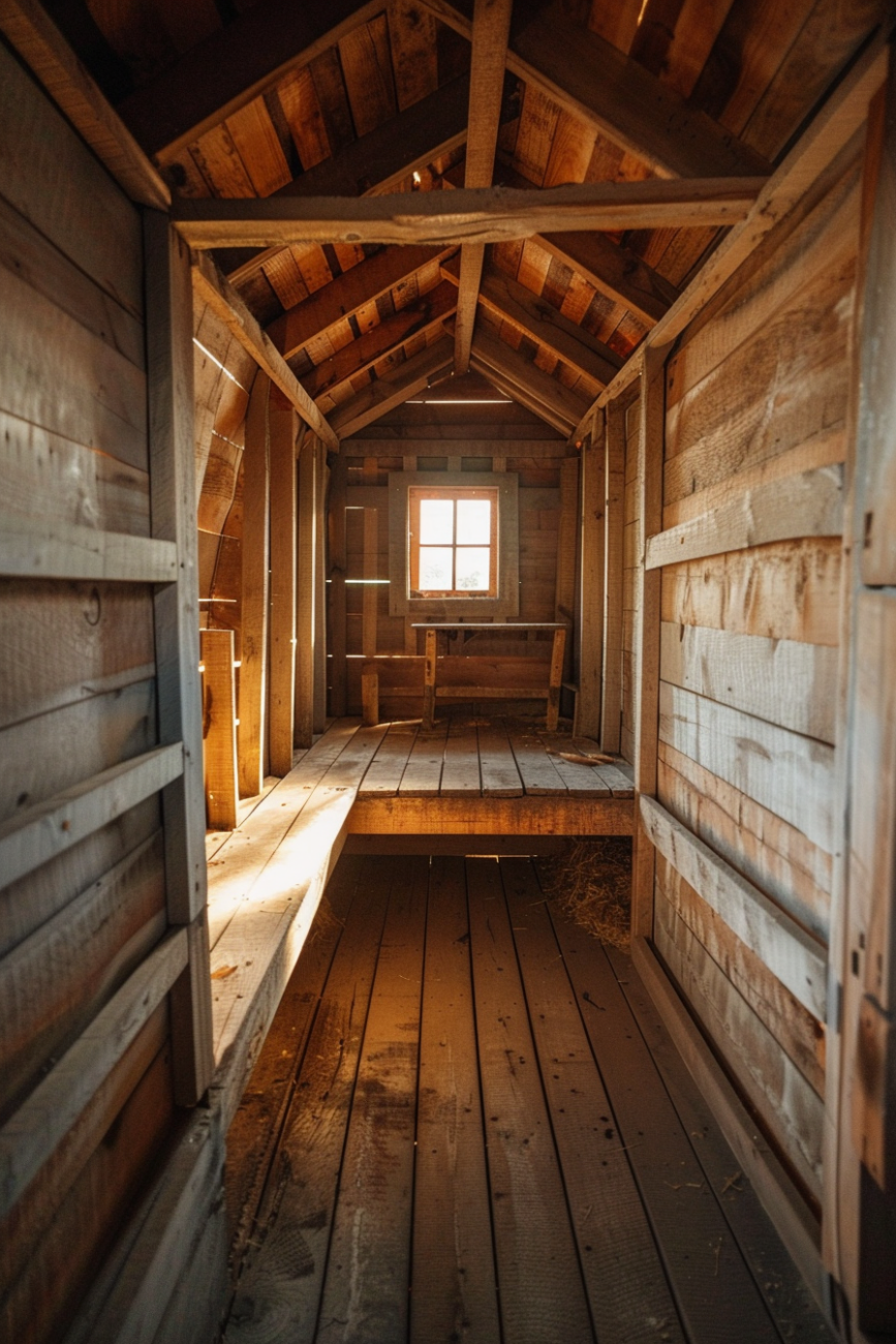 Install wooden perches along your coop’s window sills for built-in roosting and birdwatching spots. Use 2×2 boards cut to fit snugly into each window framing. Screw or glue the trim boards in place all along the sill.